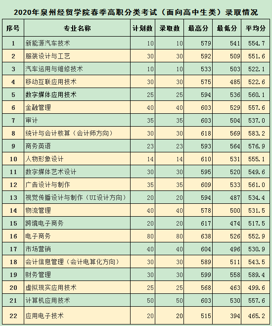 原标题:2020年泉州经贸职业技术学院高职分类考试分类分专业录取情况表(图)