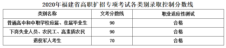 经研究决定,2020年福建省高职扩招专项考试各类别录取控制分数线具体如下: