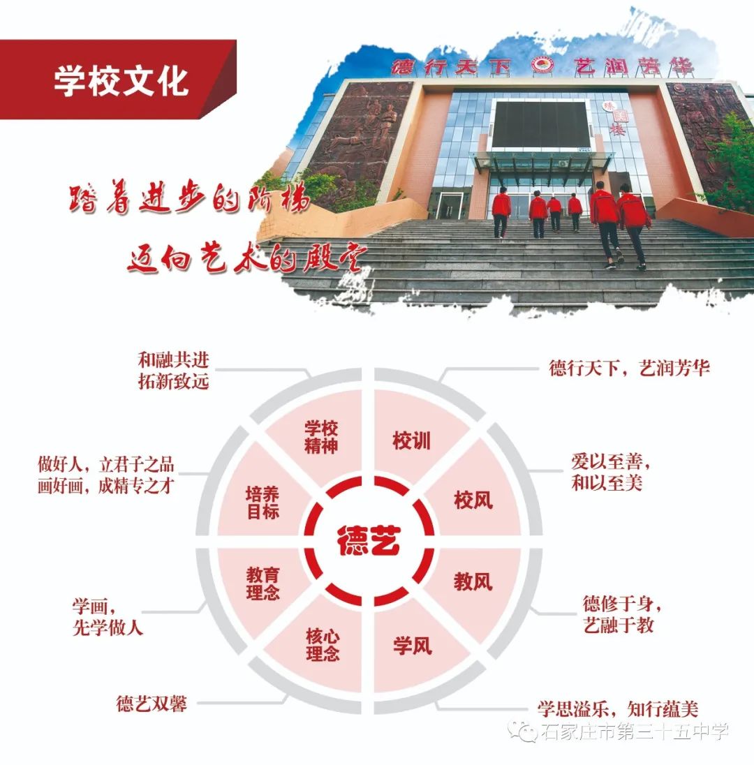50年来,学校始终坚持“德艺"为核心的办学理念、“学画,先学做人”的教育理念,打造“特色鲜明的艺术殿堂,品质卓越的现代名校”,始终坚持“质量立校、特色强校、追求卓越”的办学策略,经过多年的积累沉淀,形成了凝重的优良传统和深厚的艺术底蕴,被誉为“画家、设计师的摇篮”。在全体师生的共同努力下,今天的35中学正以管理严、校风正、学风浓、进步大,闻名燕赵大地。