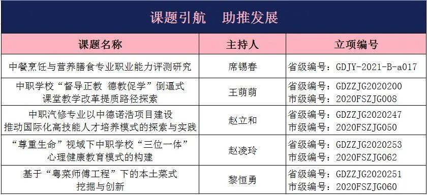 广东省粤菜师傅培训基地,广东省“双精准”示范专业,南海区公办职业学校唯一开设专业。近十年为社会输送了一大批具有中高级烹调师、面点师以及甜品饮料店专业人员。