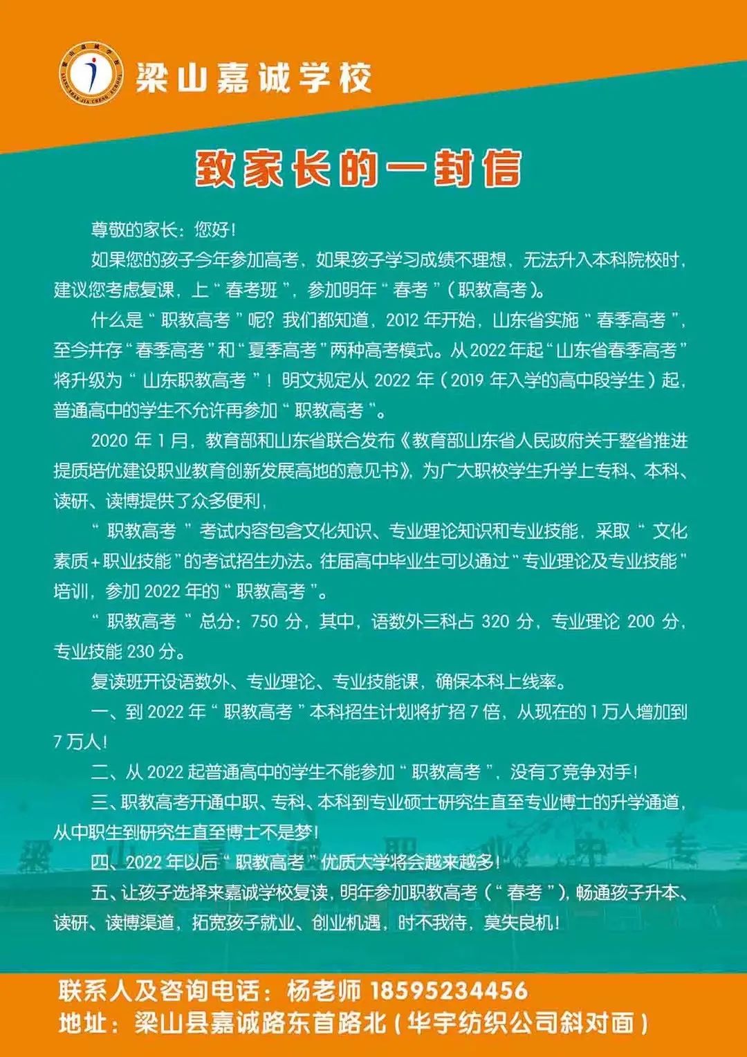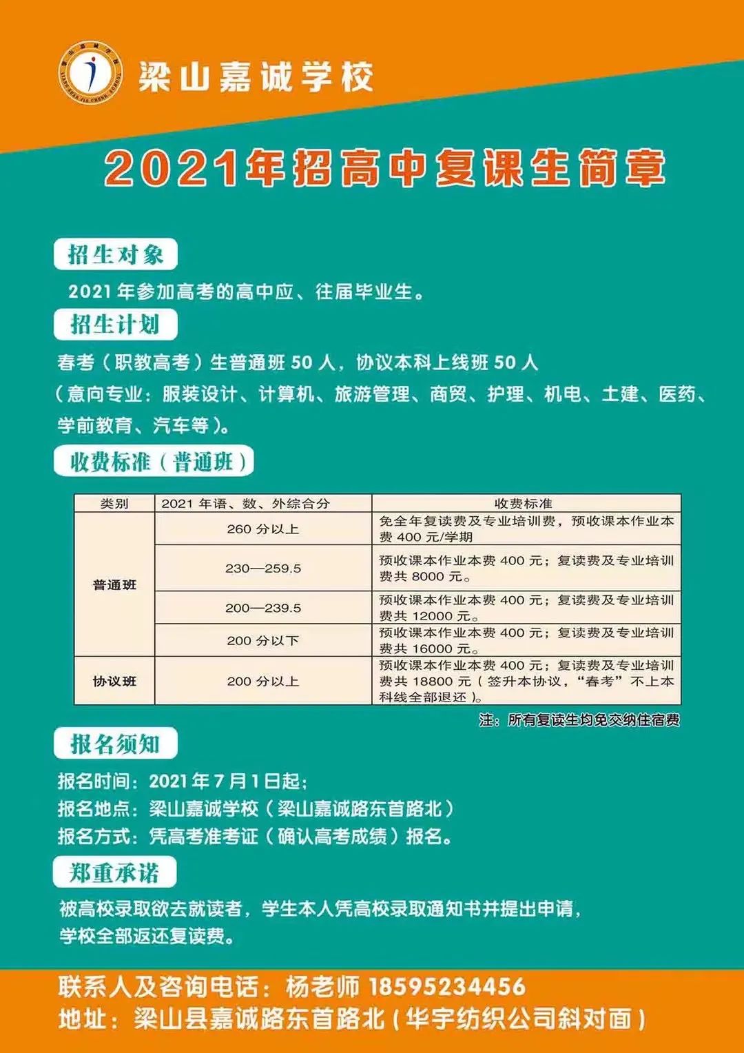 原标题:2021年梁山嘉诚职业中等专业学校复读生招生简章