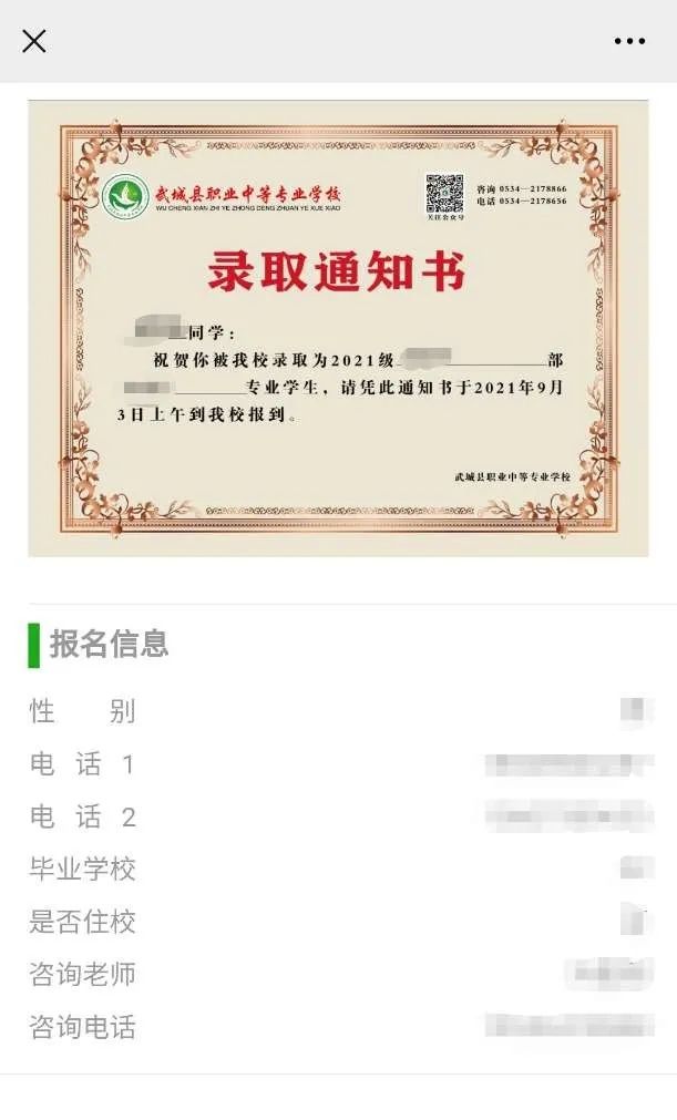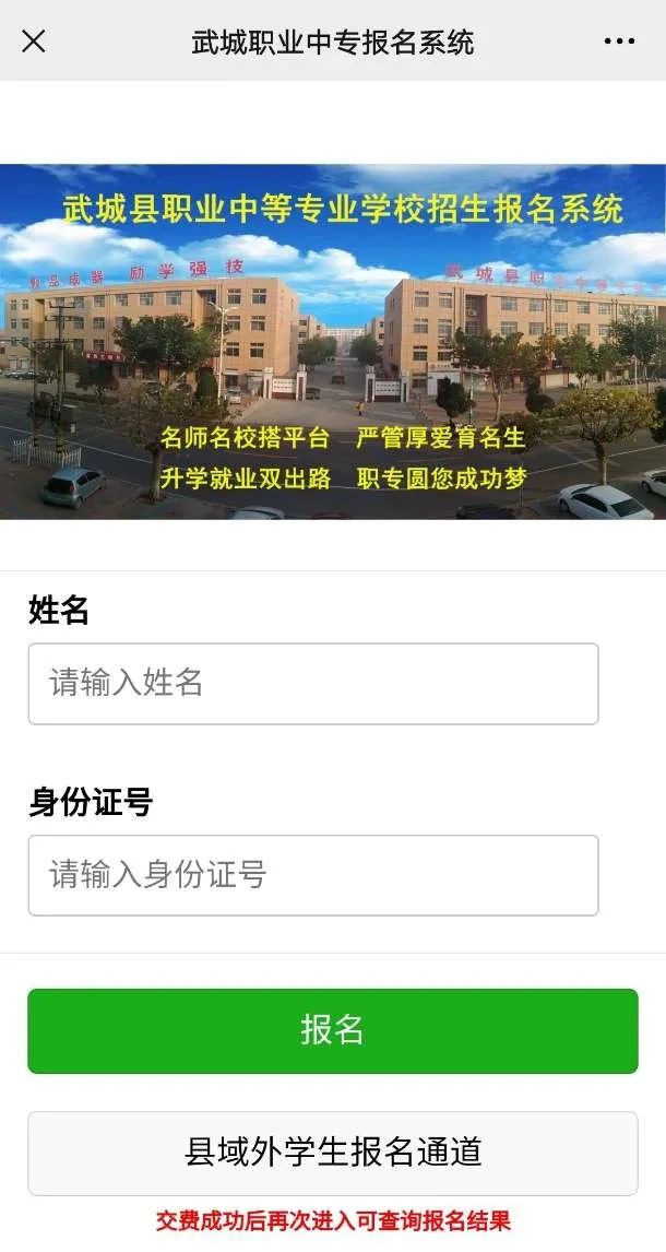(二)现场报名符合报名条件的初中毕业生携带准考证、中考成绩证明或成绩单截图到武城县职业中专现场报名并扫码。