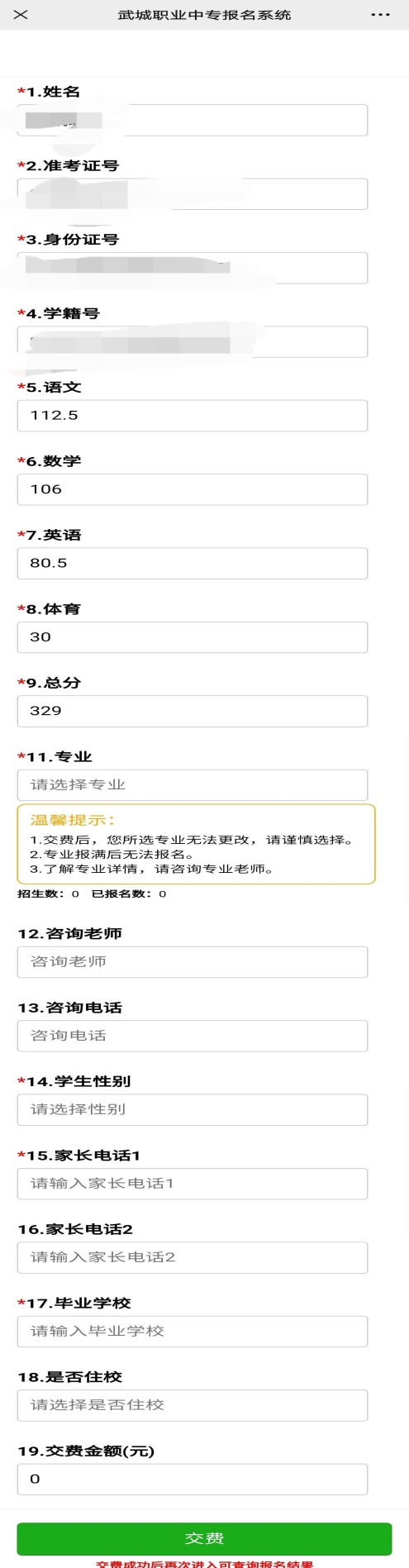 4.进入报名系统后,学生成绩可自动显示,学生选好所报专业并填全信息后即可进行交费。