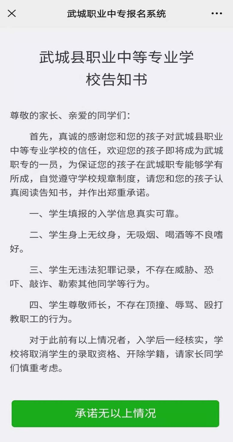 2.扫码进入后,会弹出武城县职业中等专业学校告知书,学生只有承诺无以上情况后才可进行下一步,如下图所示。