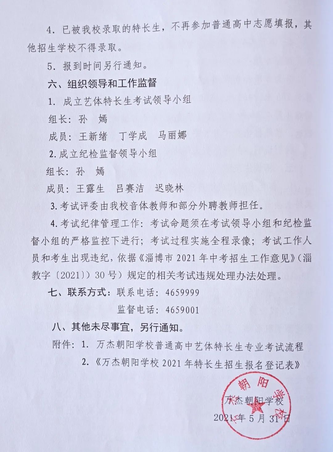 2021年万杰朝阳学校艺体特长生招生方案(图)