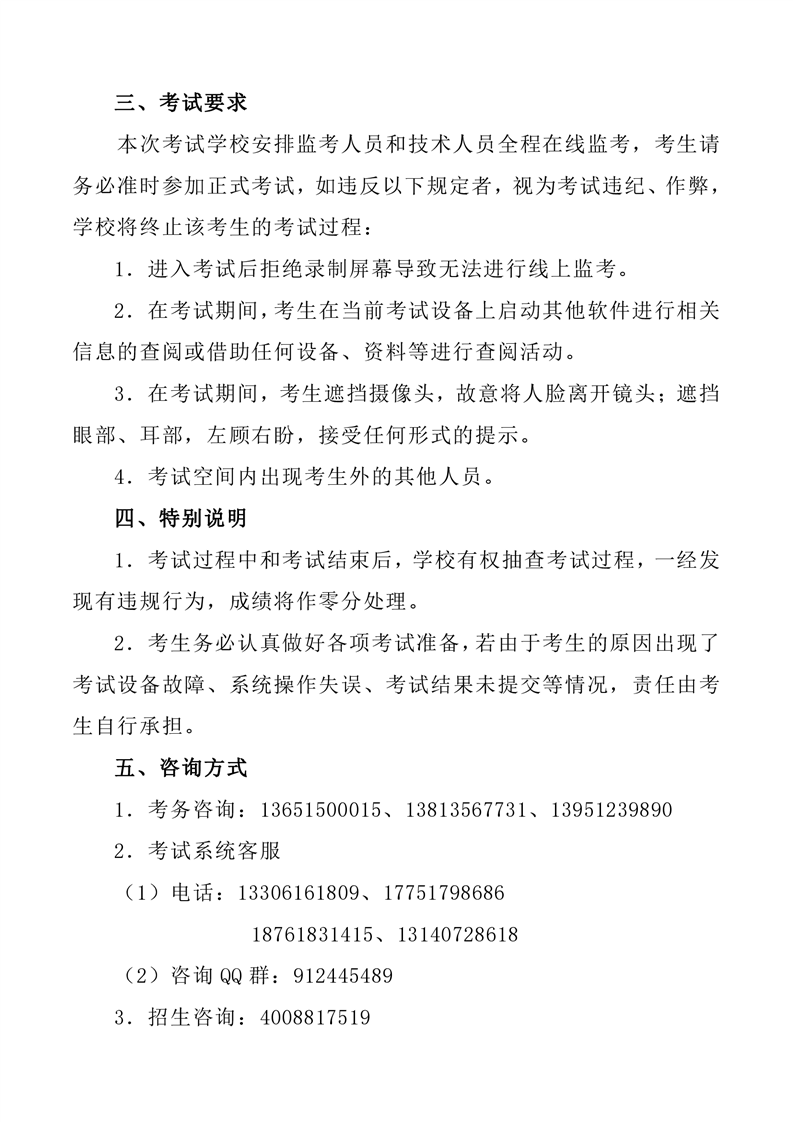 本次考试学校安排监考人员和技术人员全程在线监考,考生请务必准时参加正式考试,如违反以下规定者,视为考试违纪、作弊,学校将终止该考生的考试过程:
