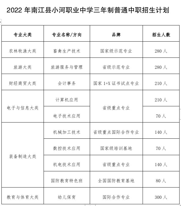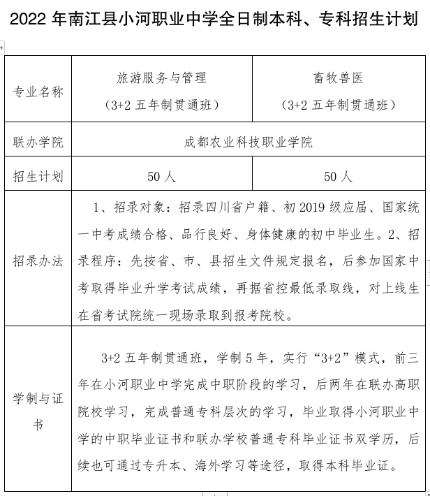 南江县小河职业中学创办于1984年,地处南江县公山镇东榆工业园,是一所“省内居前列、国内属一流、国际能交流”的国家级重点示范中职学校、国家中等职业改革发展示范校。学校占地270余亩,在校学生近5000人,建筑面积11万余平方米;校园环境优美,设施设备齐全;坚持“为党育人、为国育才”的办学目标,坚持“注重内涵发展、打造精品专业、培育实用人才、服务国家发展”的办学思路,对接区域产业打造示范专业,对接乡村振兴培育新型技能人才,做有温度、有品质、有贡献的职业教育,以准军事化的管理模式,以健全的资助体系(除国家的资助以外,另有多种资助方式),以位列全省前茅的教学质量,助力学子“高考升学梦”“技能金牌梦”“海外就业梦”“青春创业梦”。经多年发展,学校以雄厚的办学实力和优质的教学成果示范辐射川东北农村职业教育发展。