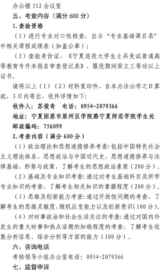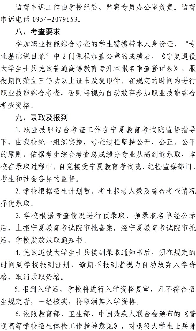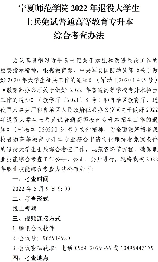 为认真贯彻习近平总书记关于加强和改进兵役工作的重要指示精神,根据教育部、中央军委国防动员部《关于做好2020年大学生征兵工作的通知》(军动[2020]485号)《教育部办公斤关于做好2022年普通高等学校专升本招生工作的通知》(教学厅[2021]8号)和自治区教育厅、退役军人享务厅和自治区人民政府征兵办公室《关于做好2022年退役大学生士兵免试普通高等教育专升本招生工作的通知》(宁教学[2022]34号)文件精神,为全面做好报考我校普通高等教育专升本专业符合申请文化课统考免试条件的退役大学生士兵综合考查工作,规范各环节流程,确保职业技能综合考查工作公平、公正、公开进行,现将我校2022年职业技能综合考查办法公布如下: