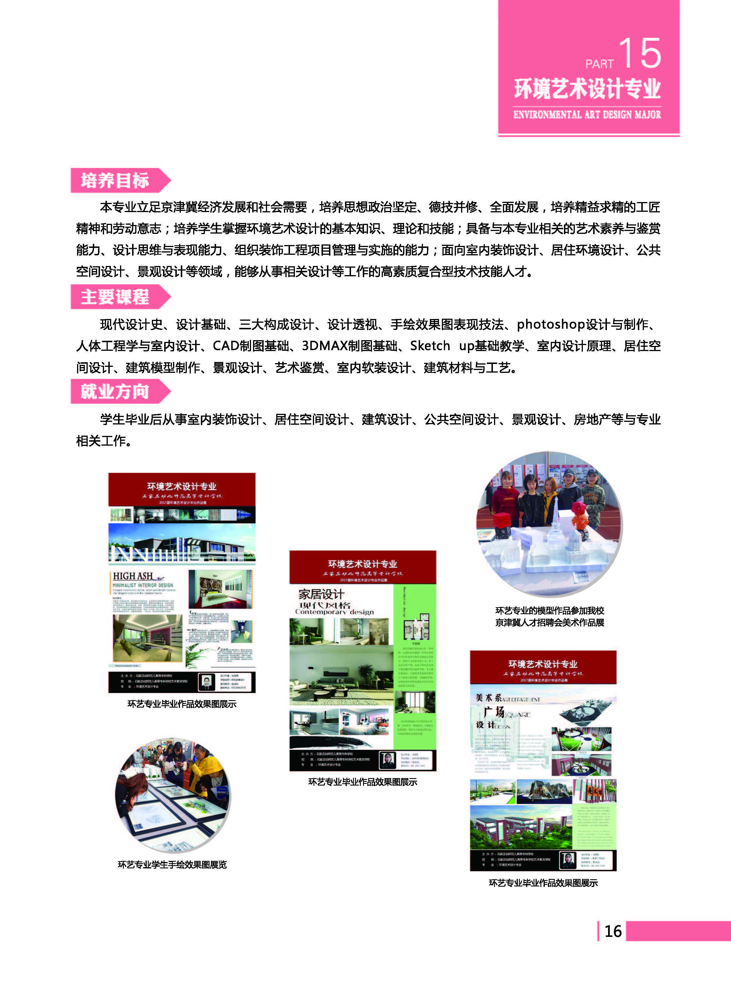 本专业立足京津冀经济发展和社会需要,培养思想政治坚定、德技并修、全面发展,培养精益求精的工匠精神和劳动意志;培养学生掌握环境艺术设计的基本知识、理论和技能;具备与本专业相关的艺术素养与鉴赏能力、设计思维与表现能力、组织装饰工程项目管理与实施的能力;面向室内装饰设计、居住环境设计、公共空间设计、景观设计等领域,能够从事相关设计等工作的高素质复合型技术技能人才。