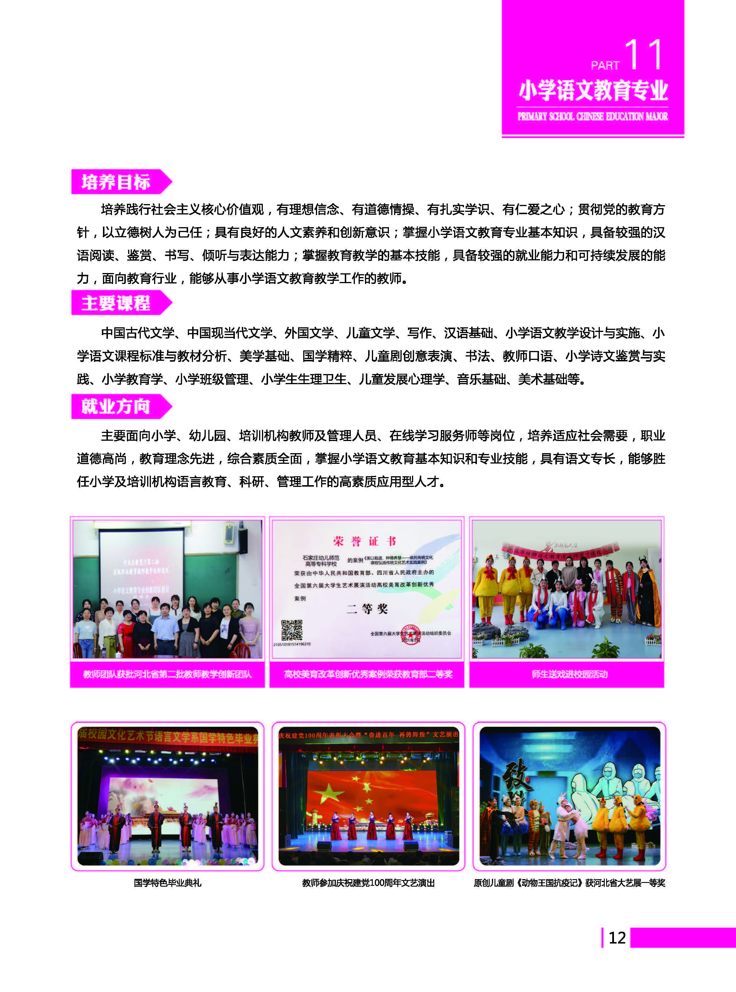 主要面向小学、幼儿园、培训机构教师及管理人员、在线学习服务师等岗位,培养适应社会需要,职业道德高尚,教育理念先进,综合素质全面,掌握小学语文教育基本知识和专业技能,具有语文专长,能够胜任小学及培训机构语言教育、科研、管理工作的高素质应用型人才。