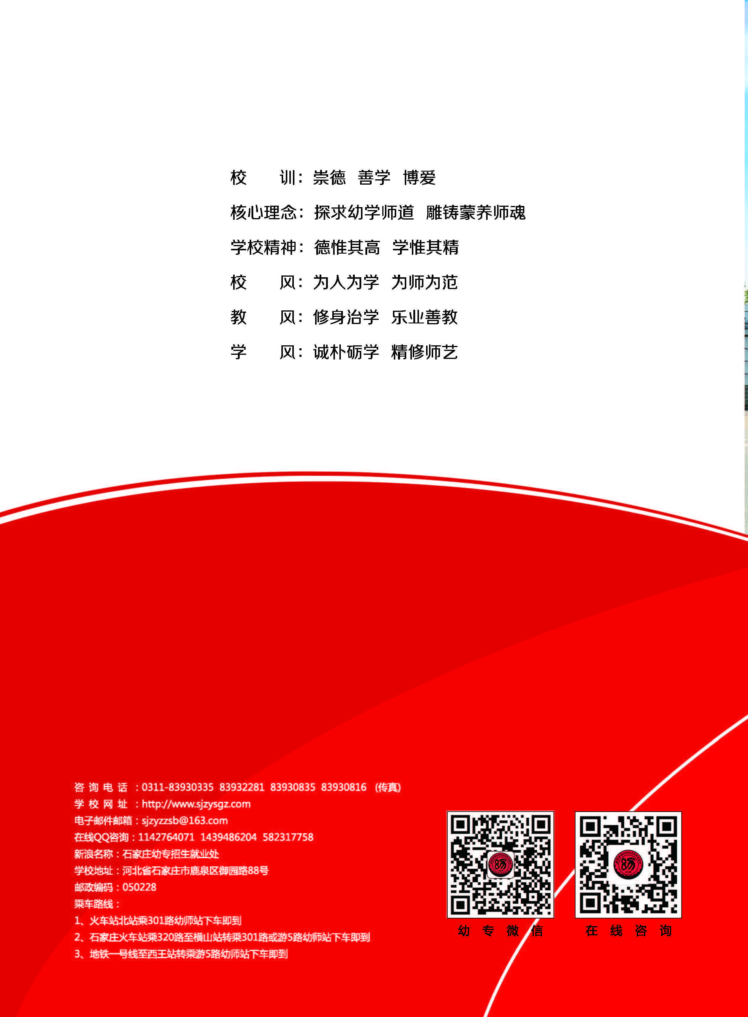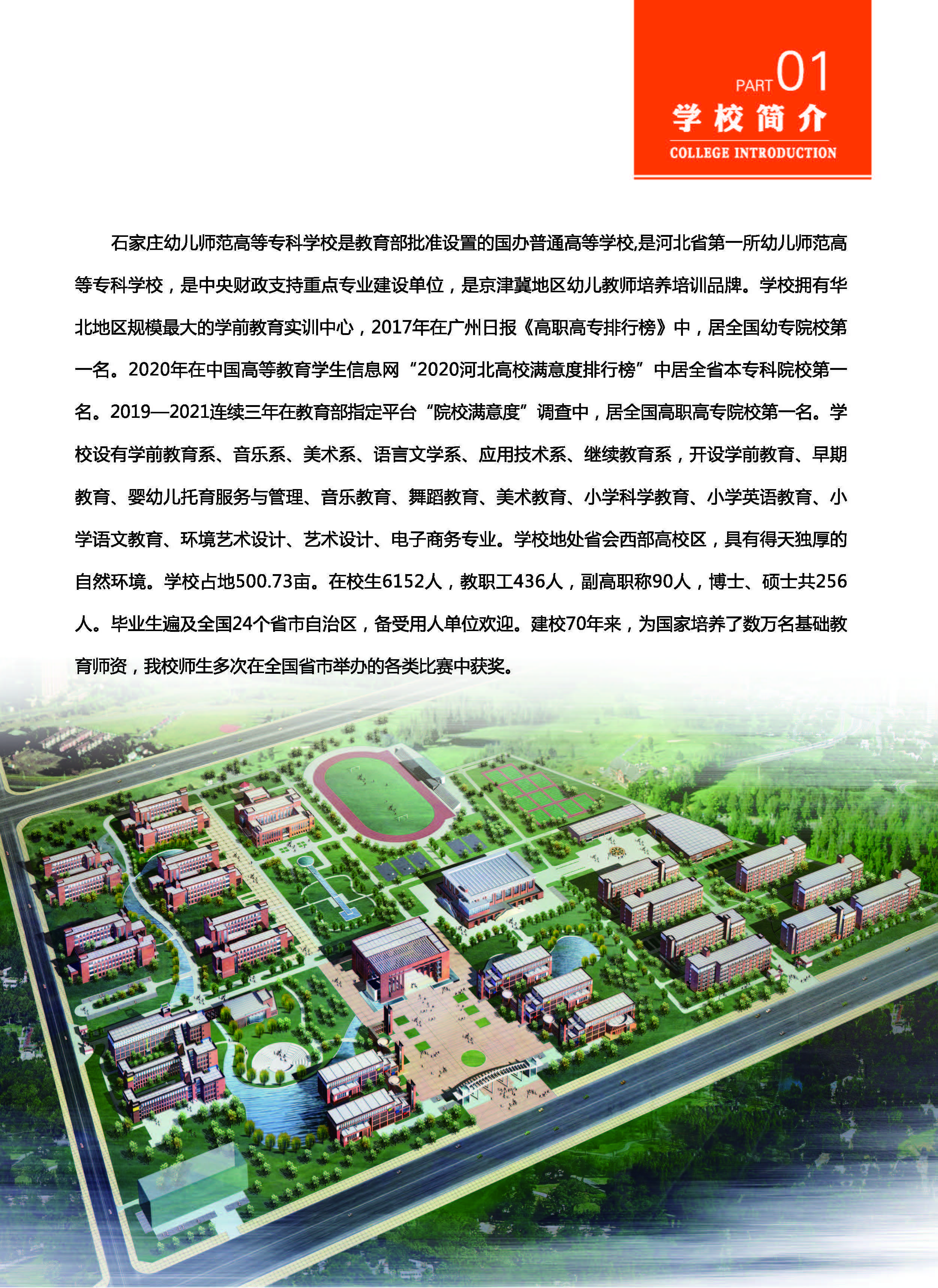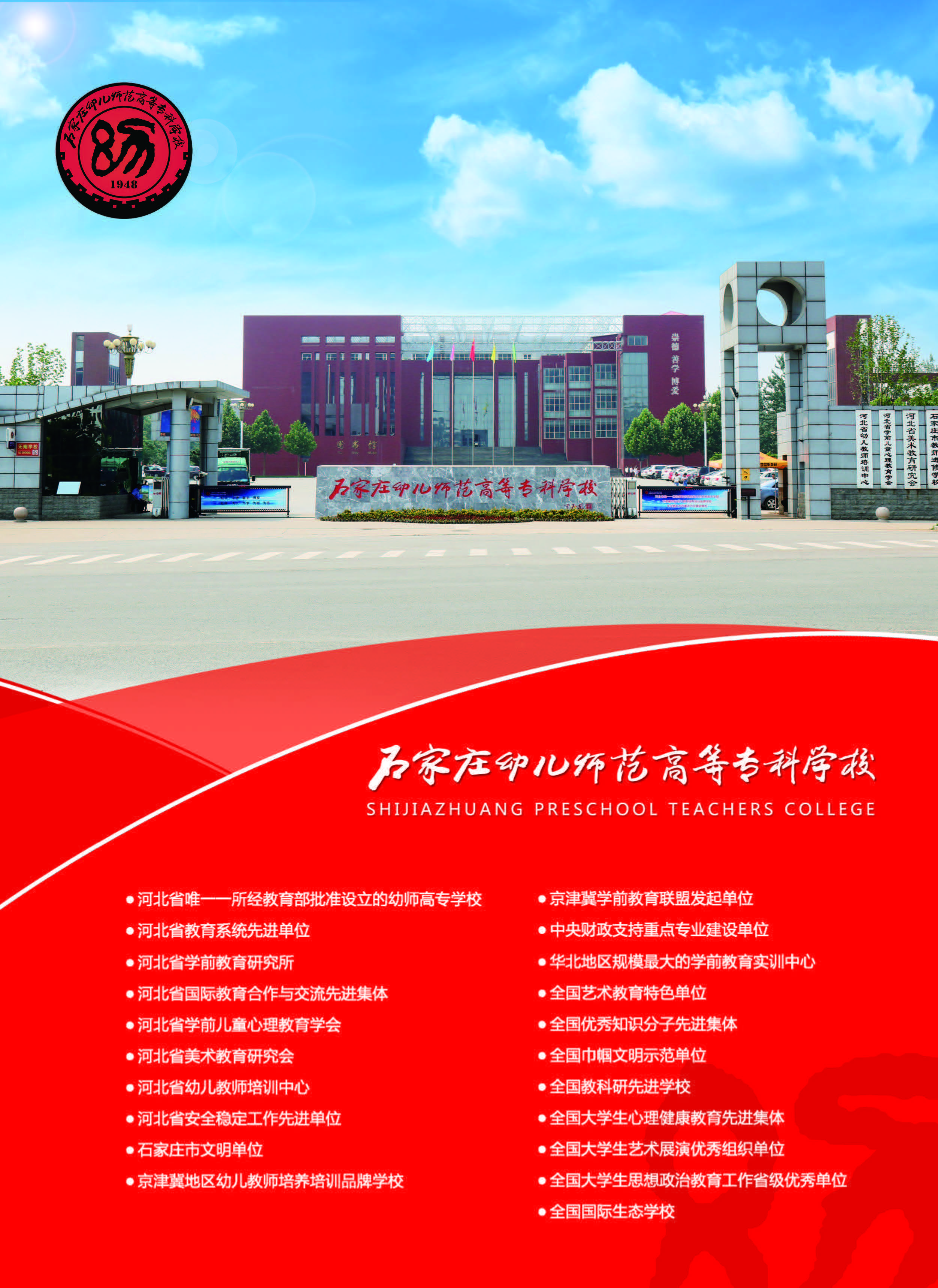 石家庄幼儿师范高等专科学校是教育部批准设置的国办普通高等学校,是河北省第一-所幼儿师范高等专科学校,是中央财政支持重点专业建设单位,是京津冀地区幼儿教师培养培训品牌。学校拥有华北地区规模最大的学前教育实训中心, 2017年在广州日报《高职高专排行榜》中,居全国幼专院校第-名。2020年在中国高等教育学生信息网"2020河北高校满意度排行榜”中居全省本专科院校第一名。2019- -2021连续三 年在教育部指定平台“院校满意度”调查中,居全国高职高专院校第-名。学校设有学前教育系、音乐系、美术系、语言文学系、应用技术系、继续教育系,开设学前教育、早期教育、婴幼儿托育服务与管理、音乐教育、舞蹈教育、美术教育、小学科学教育、小学英语教育、小学语文教育、环境艺术设计、艺术设计、电子商务专业。学校地处省会西部高校区,具有得天独厚的自然环境。学校占地500.73亩.在校生6152人,教职工436人,副高职称90人,博士、硕士共256人。毕业生遍及全国24个省市自治区,备受用人单位欢迎。建校70年来,为国家培养了数万名基础教育师资,我校师生多次在全国省市举办的各类比赛中获奖。