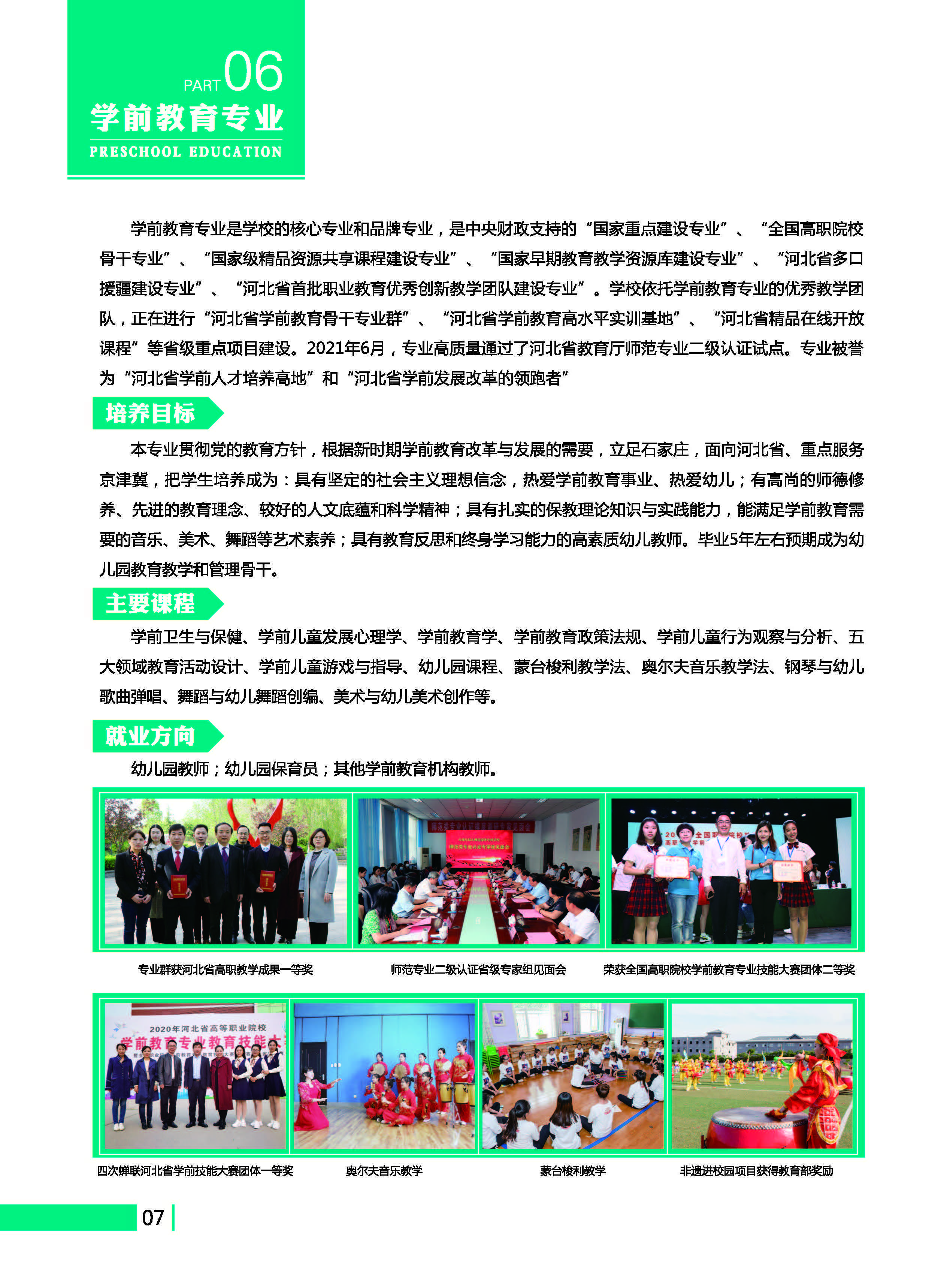 学前教育专业是学校的核心专业和品牌专业,是中央财政支持的“国家重点建设专业”、“全国高职院校骨干专业”、“国家级精品资源共享课程建设专业”、“国家早期教育教学资源库建设专业”、“河北省多口援疆建设专业”、“河北省首批职业教育优秀创新教学团队建设专业”。学校依托学前教育专业的优秀教学团队,正在进行“河北省学前教育骨干专业群”、“河北省学前教育高水平实训基地”、“河北省精品在线开放课程”等省级重点项目建设。2021年6月,专业高质量通过了河北省教育厅师范专业二级认证试点。专业被誉为“河北省学前人才培养高地”和“河北省学前发展改革的领跑者”。