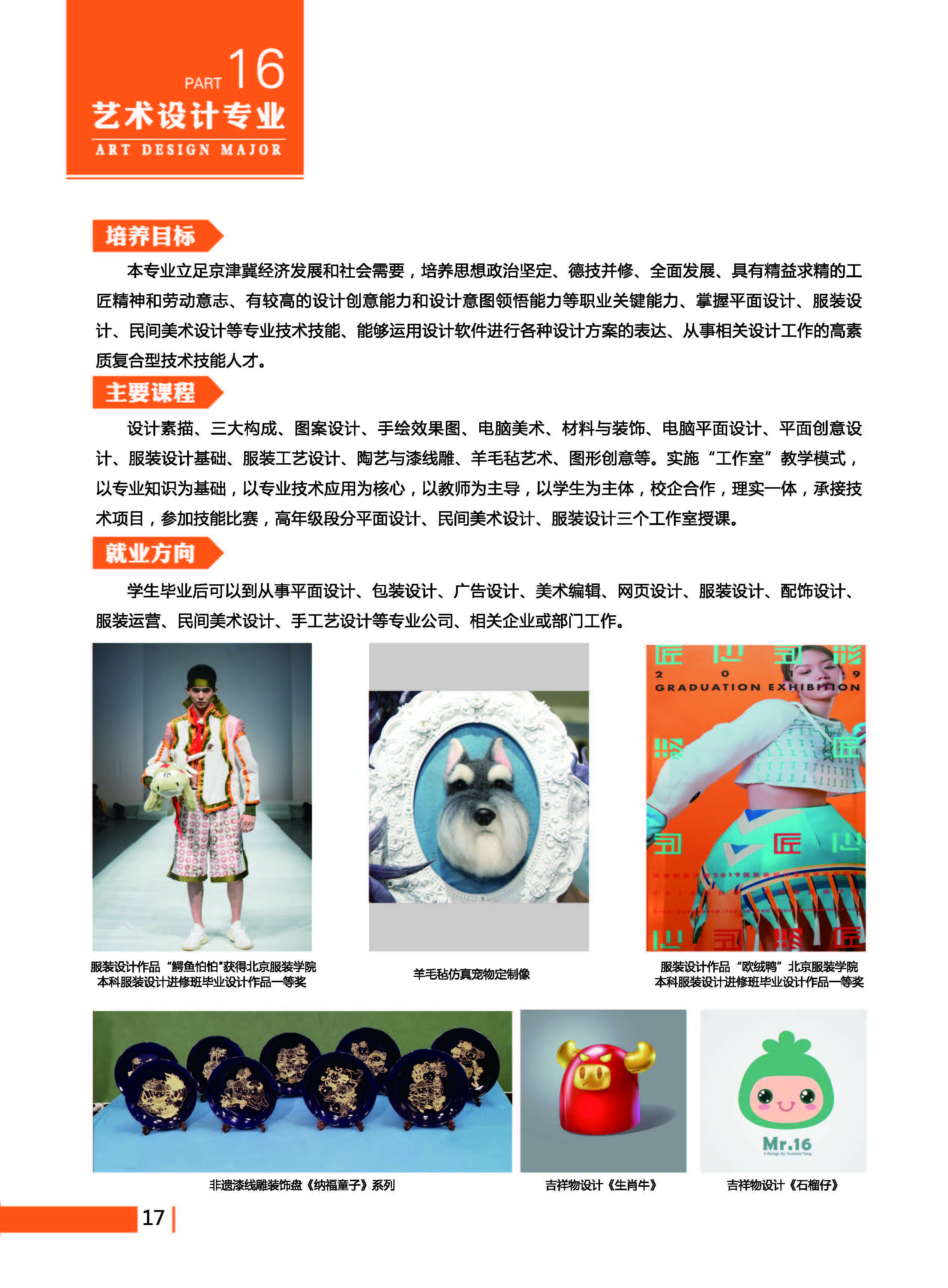 本专业立足京津冀经济发展和社会需要,培养思想政治坚定、德技并修、全面发展、具有精益求精的工匠精神和劳动意志、有较高的设计创意能力和设计意图领悟能力等职业关键能力、掌握平面设计、服装设计、民间美术设计等专业技术技能、能够运用设计软件进行各种设计方案的表达、从事相关设计工作的高素质复合型技术技能人才。