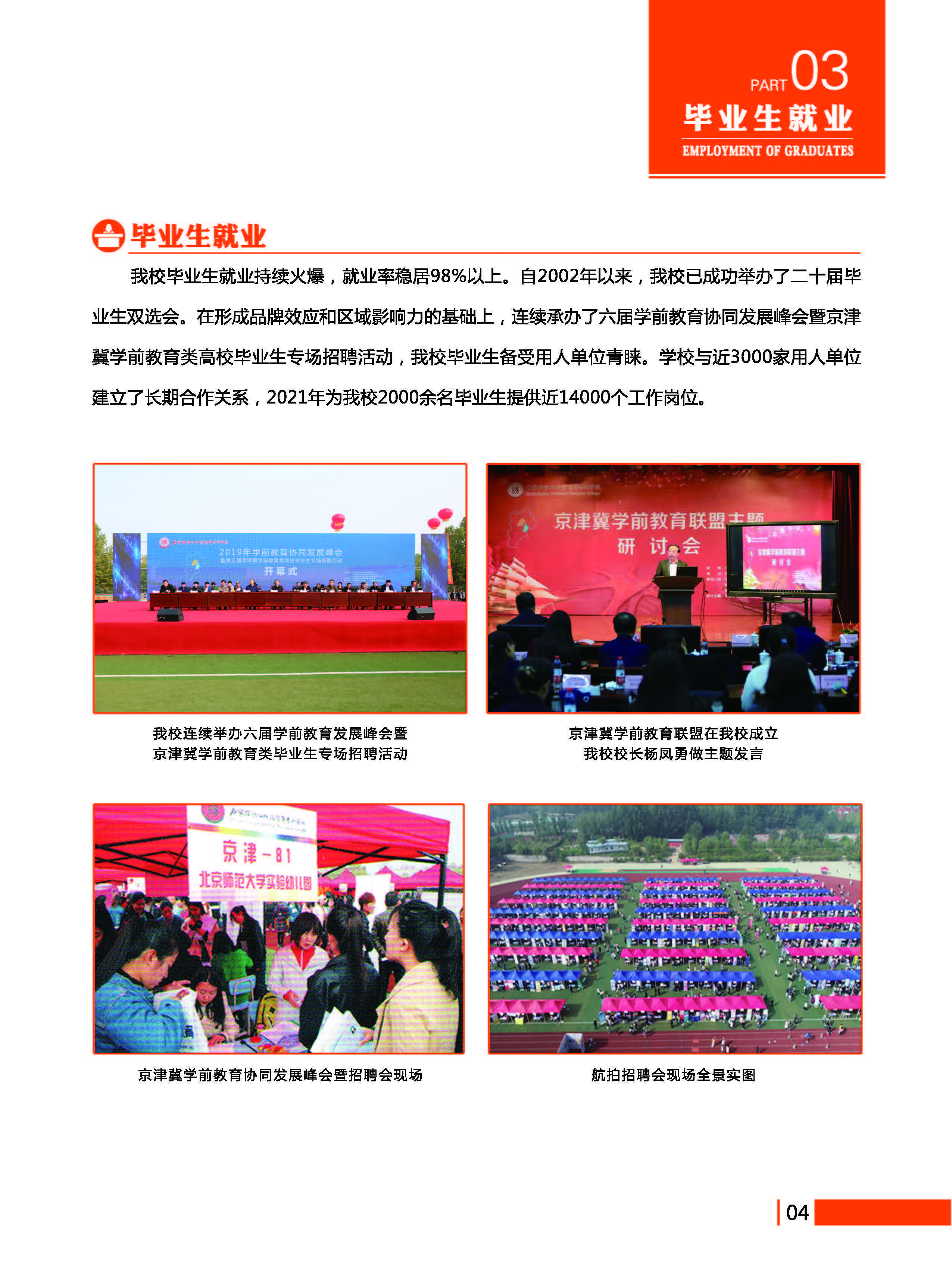 我校毕业生就业持续火爆,就业率稳居98%以上。自2002年以来,我校已成功举办了二十届毕业生双选会。在形成品牌效应和区域影响力的基础上,连续承办了六届学前教育协同发展峰会暨京津冀学前教育类高校毕业生专场招聘活动,我校毕业生备受用人单位青睐。学校与近3000家用人单位建立了长期合作关系, 2021年为我校2000余名毕业生提供近14000个工作岗位。