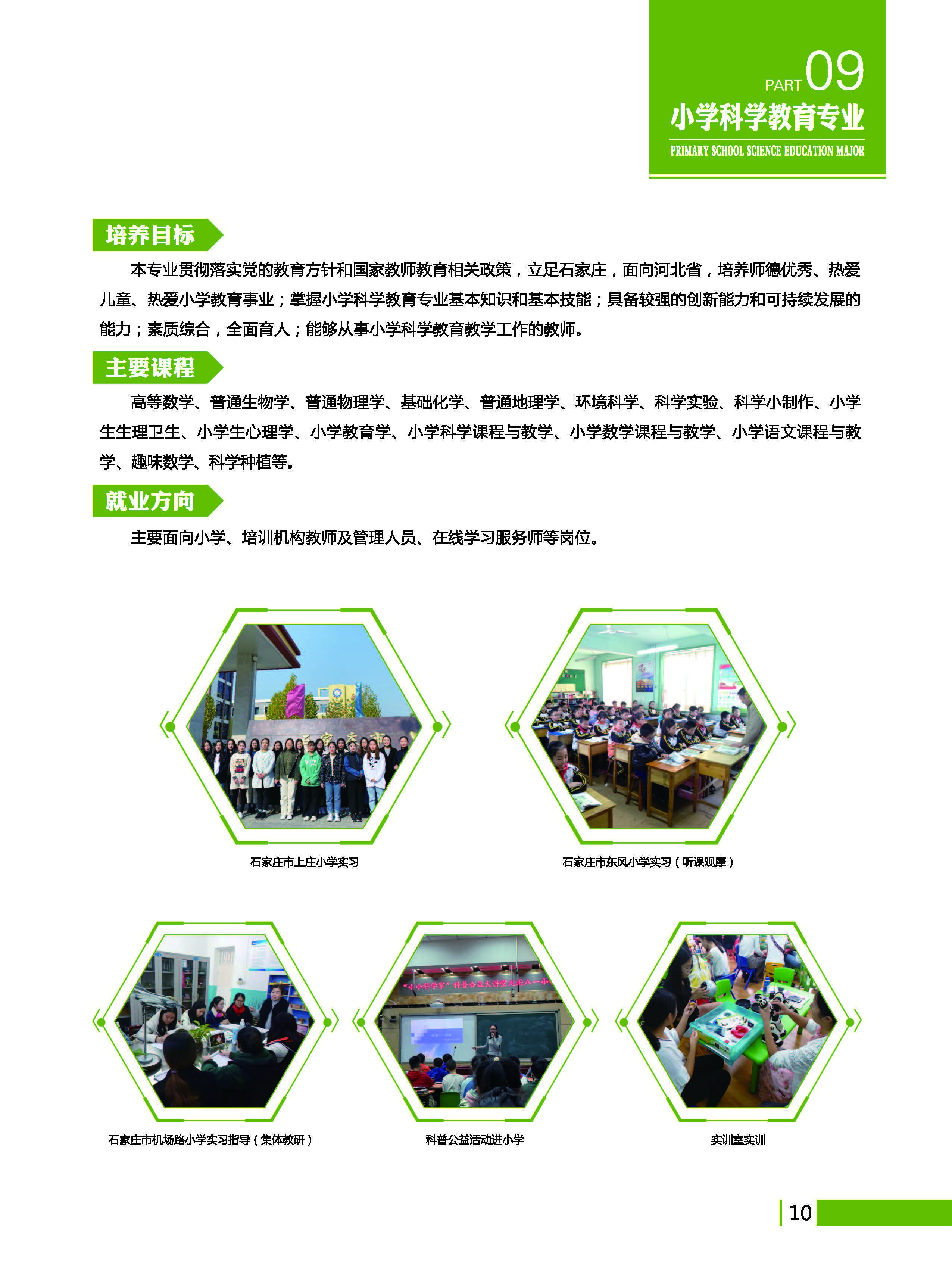 本专业贯彻落实党的教育方针和国家教师教育相关政策,立足石家庄,面向河北省,培养师德优秀、热爱儿童、热爱小学教育事业;掌握小学科学教育专业基本知识和基本技能;具备较强的创新能力和可持续发展的能力;素质综合,全面育人;能够从事小学科学教育教学工作的教师。