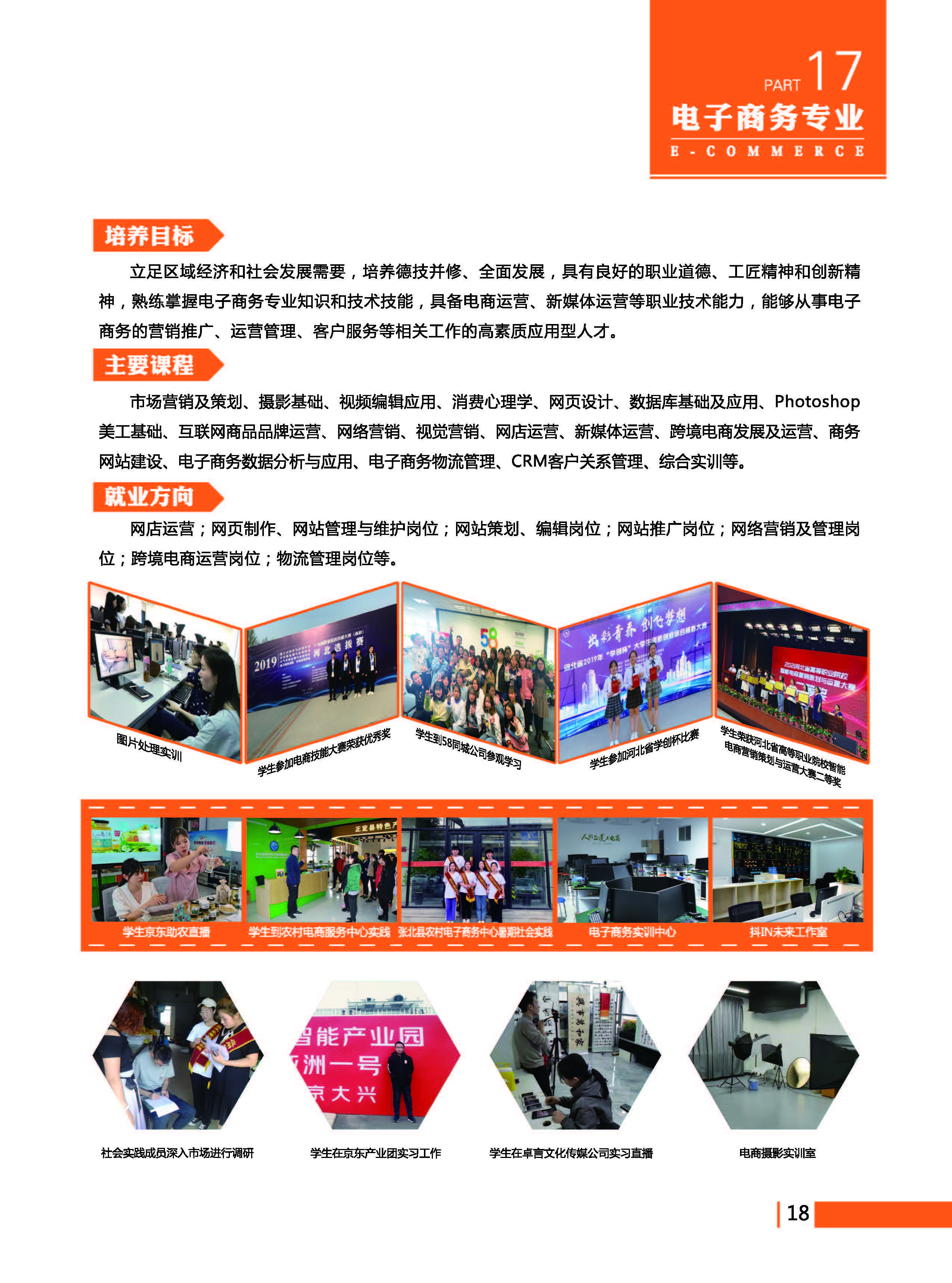 市场营销及策划、摄影基础、视频编辑应用、消费心理学、网页设计、数据库基础及应用、Photoshop美工基础、互联网商品品牌运营、网络营销、视觉营销、网店运营、新媒体运营、跨境电商发展及运营、商务网站建设、电子商务数据分析与应用、电子商务物流管理、CRM客户关系管理、综合实训等。