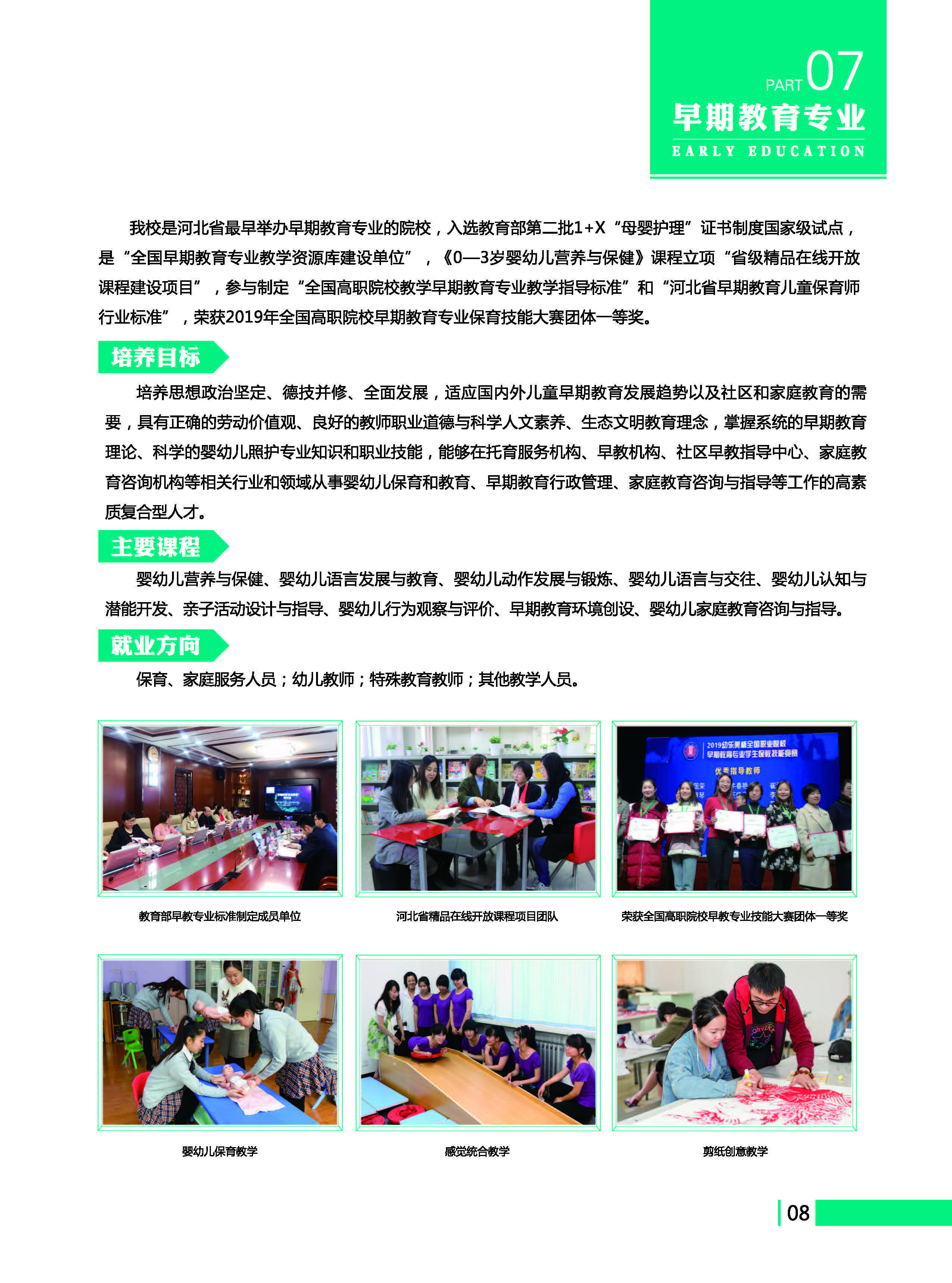 我校是河北省最早举办早期教育专业的院校,入选教育部第二批1+X“母婴护理”证书制度国家级试点,是“全国早期教育专业教学资源库建设单位”,《0一3岁婴幼儿营养与保健》课程立项“省级精品在线开放课程建设项目”,参与制定“全国高职院校教学早期教育专业教学指导标准”和“河北省早期教育儿童保育师行业标准”,荣获2019年全国高职院校早期教育专业保育技能大赛团体一等奖。