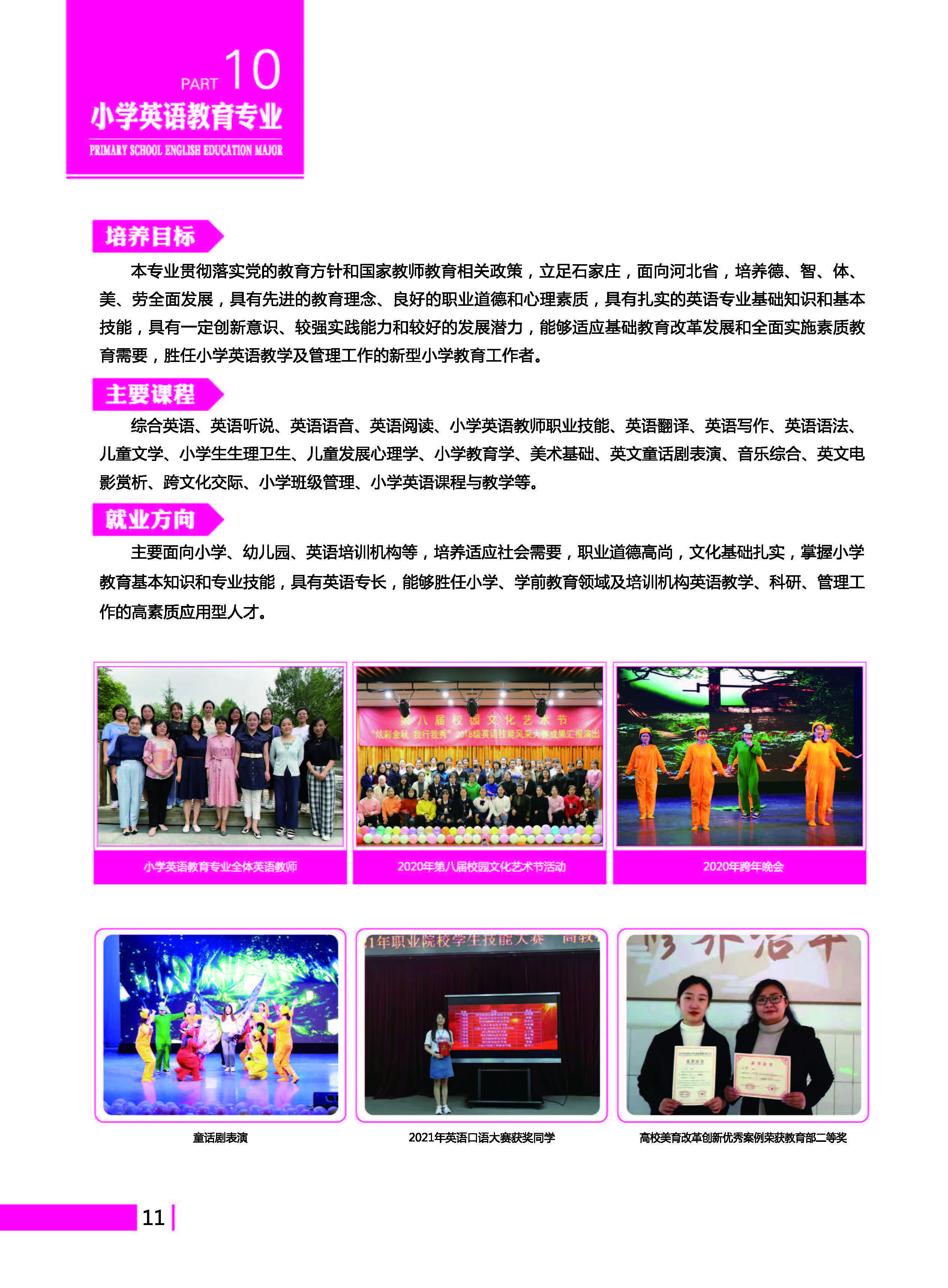 本专业贯彻落实党的教育方针和国家教师教育相关政策,立足石家庄,面向河北省,培养德、智、体、美、劳全面发展,具有先进的教育理念、良好的职业道德和心理素质,具有扎实的英语专业基础知识和基本技能,具有一定创新意识、较强实践能力和较好的发展潜力,能够适应基础教育改革发展和全面实施素质教育需要,胜任小学英语教学及管理工作的新型小学教育工作者。