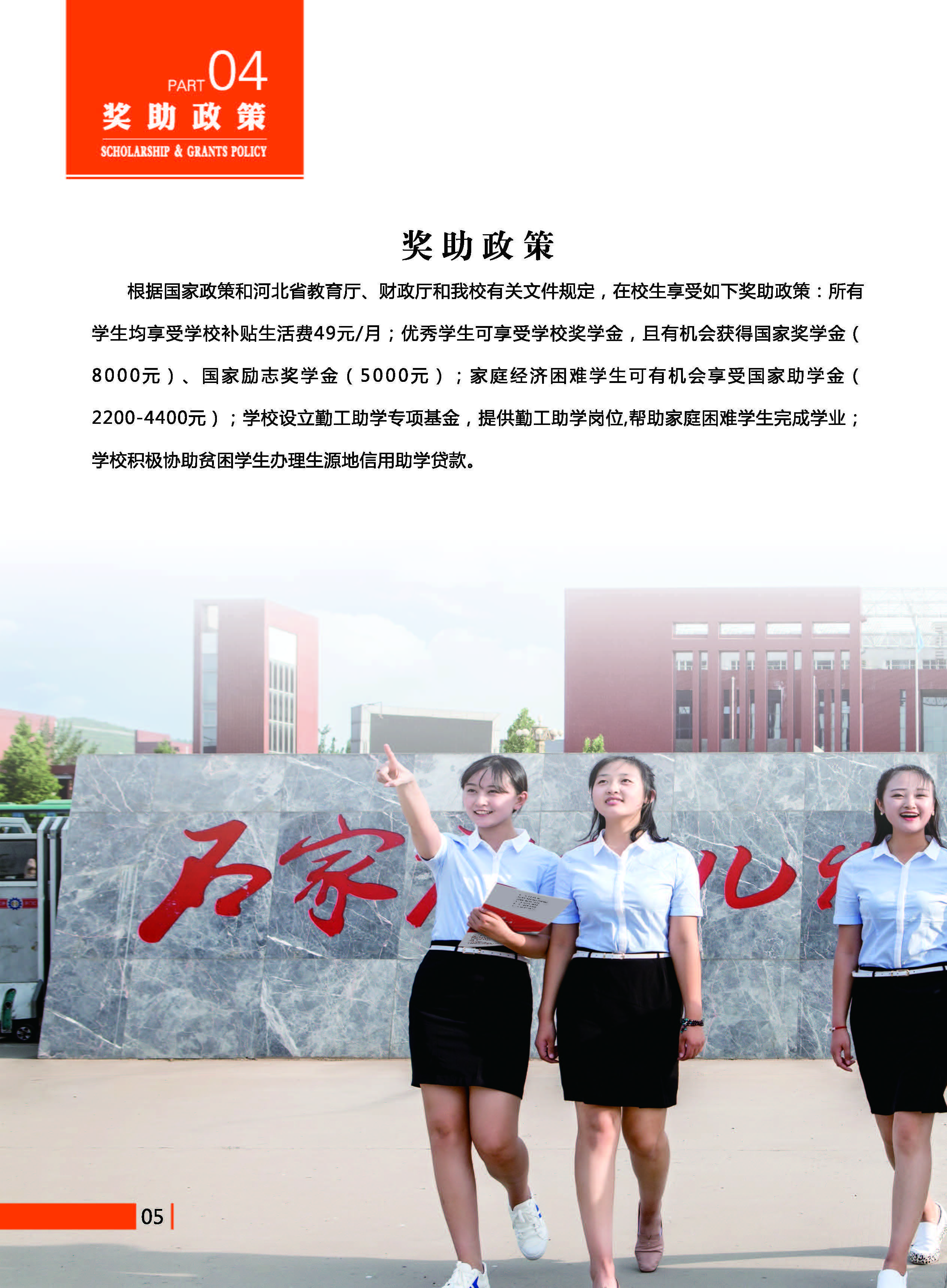 根据国家政策和河北省教育厅、财政厅和我校有关文件规定,在校生享受如下奖助政策:所有学生均享受学校补贴生活费49元/月;优秀学生可享受学校奖学金,且有机会获得国家奖学金(8000元)、国家励志奖学金( 5000元) ; 家庭经济困难学生可有机会享受国家助学金(2200-4400元) ; 学校设立勤工助学专项基金,提供勤工助学岗位,帮助家庭困难学生完成学业;学校积极协助贫困学生办理生源地信用助学贷款。