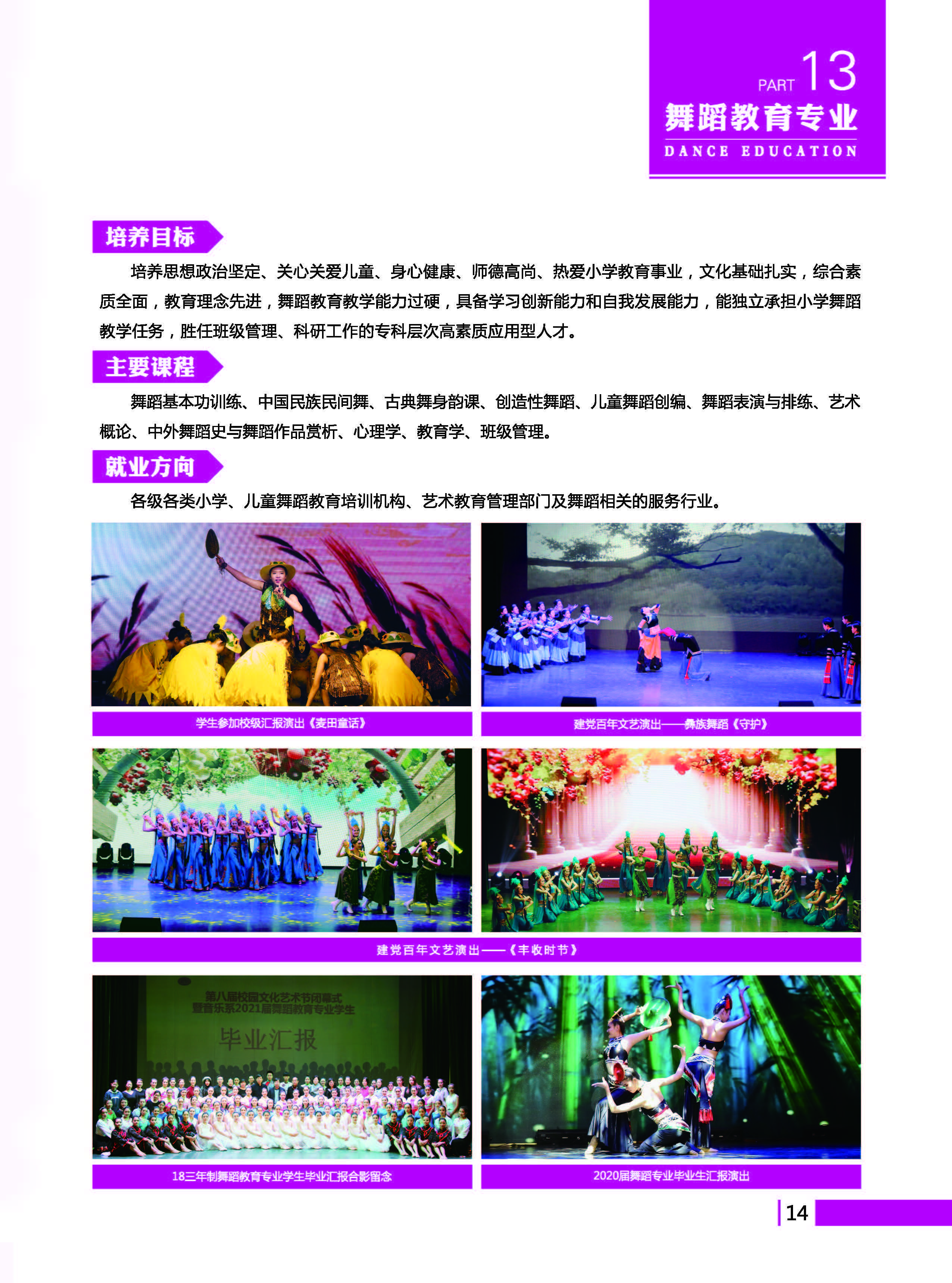 培养思想政治坚定、关心关爱儿童、身心健康、师德高尚、热爱小学教育事业,文化基础扎实,综合素质全面,教育理念先进,舞蹈教育教学能力过硬,具备学习创新能力和自我发展能力,能独立承担小学舞蹈教学任务,胜任班级管理、科研工作的专科层次高素质应用型人才。